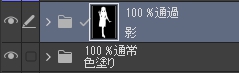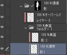 それらを全て、レイヤー効果を[通過]にしたフォルダ(以下影フォルダと呼称)にまとめていれます。